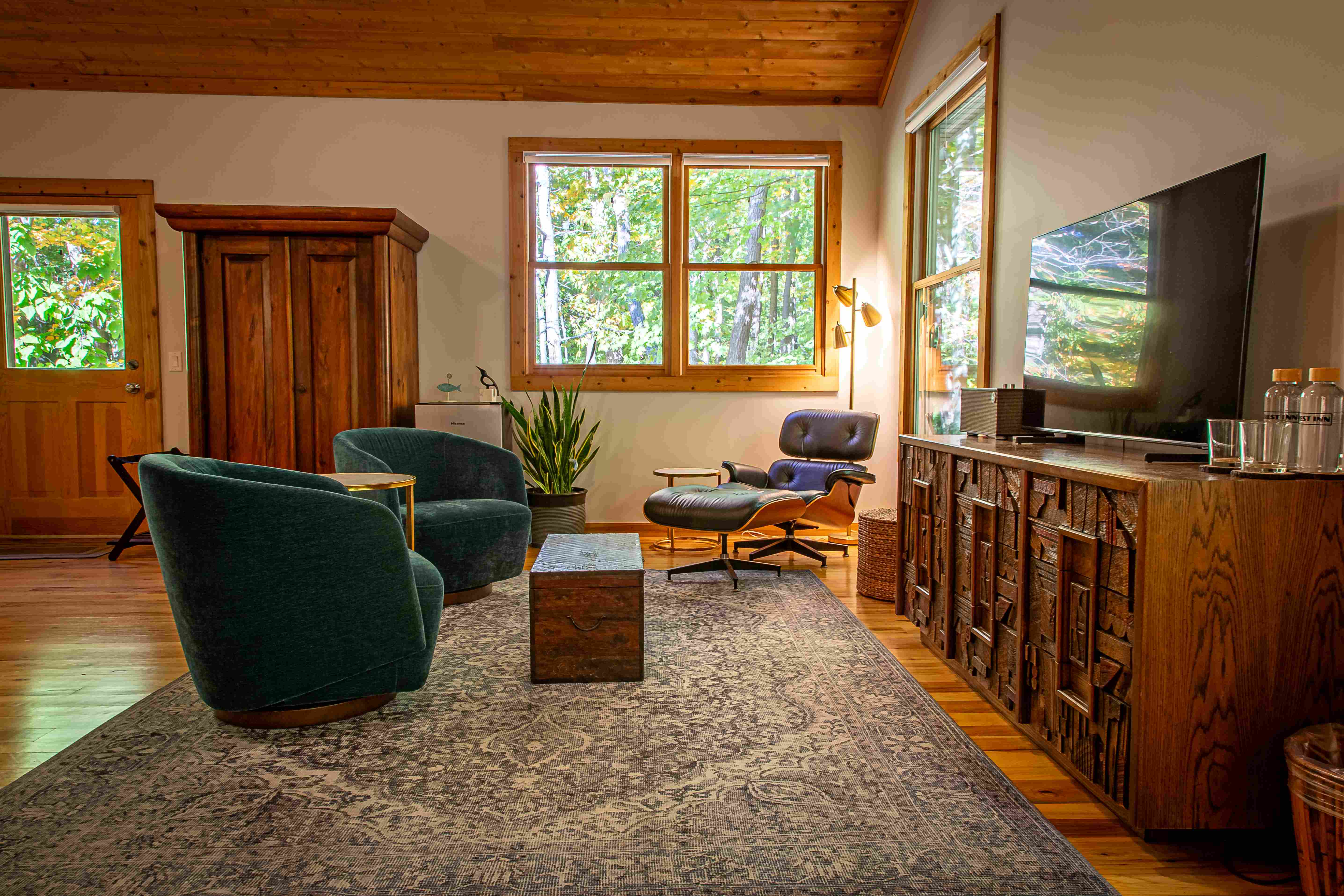 Secluded in the back of the house is Forest Inn’s most spacious suite, boasting an expansive 478 square feet. Immerse yourself in the outdoor serenity of your private deck overlooking the woods, or choose the sitting area to relax in solitude with a good read. Vaulted ceilings in the main room and luxurious bathroom make this peaceful, quiet space feel as if it goes on forever. Dedicated heating and cooling system, plus radiant heated bathroom floor provide ultimate comfort.